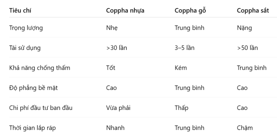 Khi so sánh tổng thể, coppha nhựa và chốt cốp pha giúp tối ưu cả chi phí – thời gian – độ an toàn, đồng thời mang lại hình ảnh chuyên nghiệp cho sân khấu hoặc công trình.