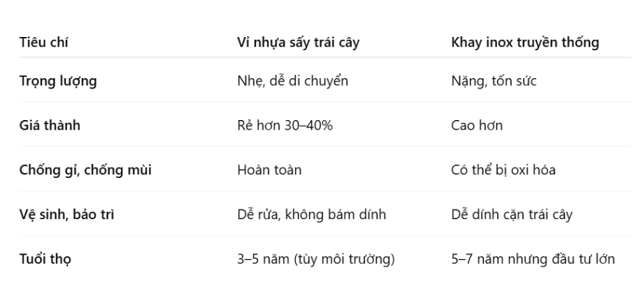 Nếu bạn đang bắt đầu mô hình sấy trái cây quy mô nhỏ – vừa, thì vỉ nhựa là lựa chọn “tối ưu chi phí – hiệu quả lâu dài”.